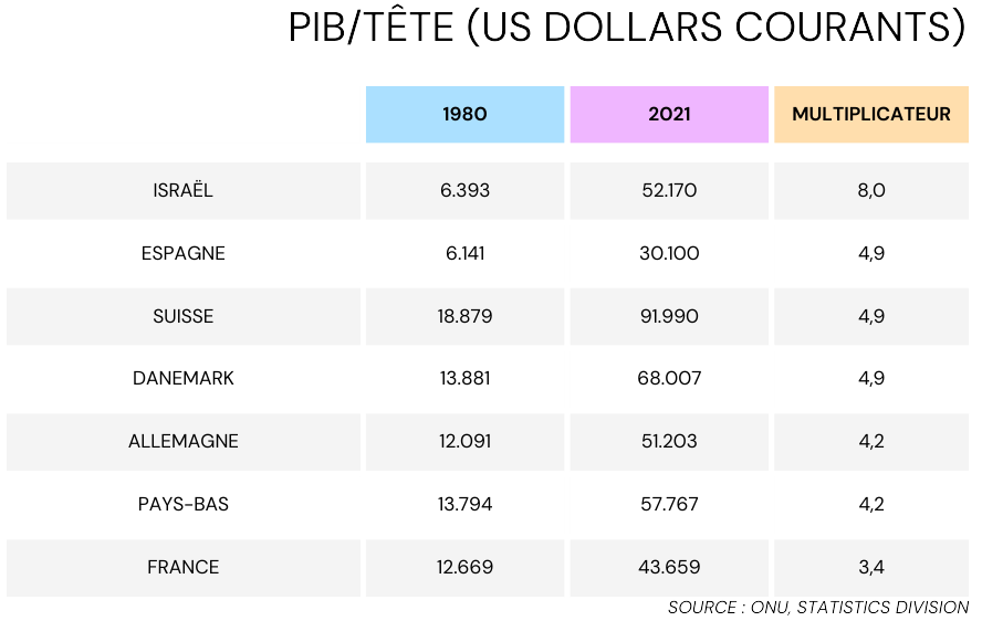 Les statisticiens des Nations-Unies ont publié en 2018 une étude dans laquelle ils ont examiné comment les économies des différents pays ont évolué dans la longue période. C’est, en effet, sur une longue période qu’il faut appréhender les évolutions afin de se dégager des variations conjoncturelles qui masquent les tendances de fond. Nous reproduisons, ci-dessous, les données de cette étude pour les grands pays européens, en prolongeant les séries jusqu’en 2021, et en ajoutant le cas d’Israël qui est particulièrement remarquable :