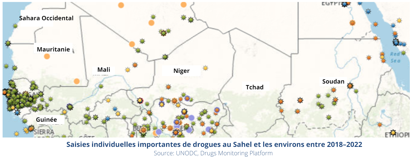 Les autres pays côtiers, principalement du Golfe de Guinée sont aussi des portes d’entrée de la drogue au Sahel : au Togo, l’Office central de répression du trafic illicite des drogues et du blanchiment (OCRTIDB) a saisi 8 tonnes de drogues en 2021, 50 tonnes en 2022. En novembre 2022, 2 tonnes de cocaïne étaient saisies dans le port d’Abidjan : direction probable de cette marchandise, le Mali voisin.